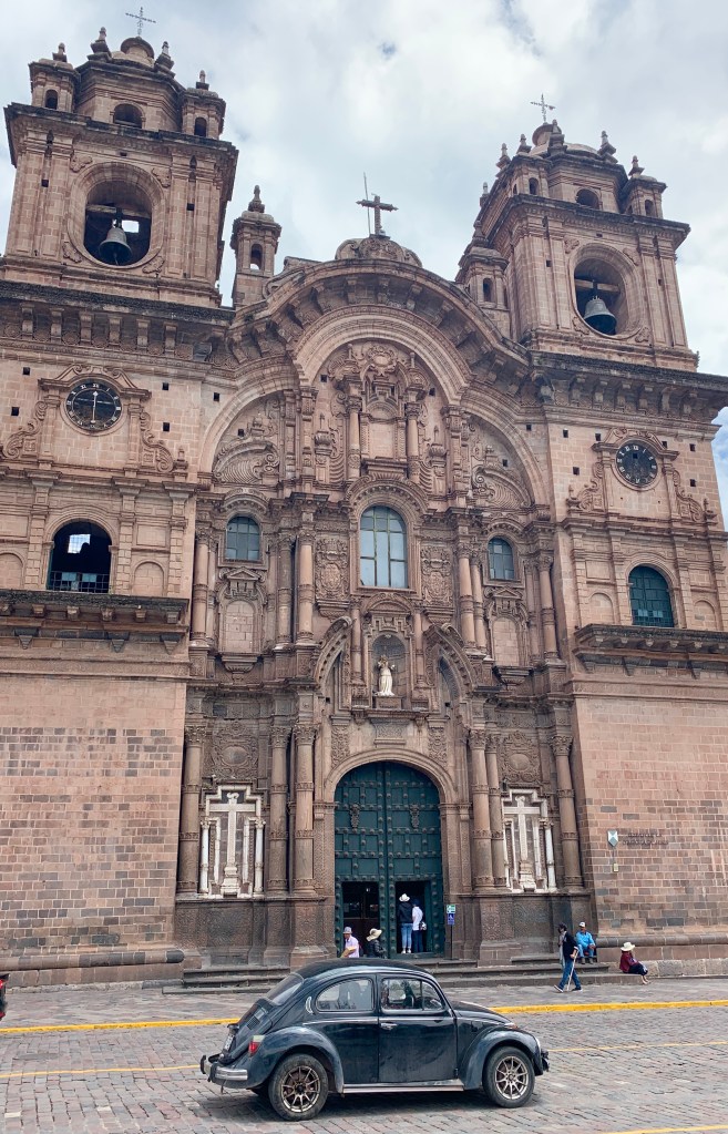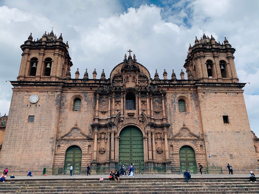 The Cusco Cathedral dominates the plaza with its heavy stone walls and twin towers. Construction began in the mid-16th century using blocks taken from the nearby Inca palace of Viracocha. Inside, Catholic imagery mixes with Andean symbolism, reflecting how Indigenous belief systems endured under colonial rule. One striking example is a painting of the Last Supper that features guinea pig, a traditional Andean dish.