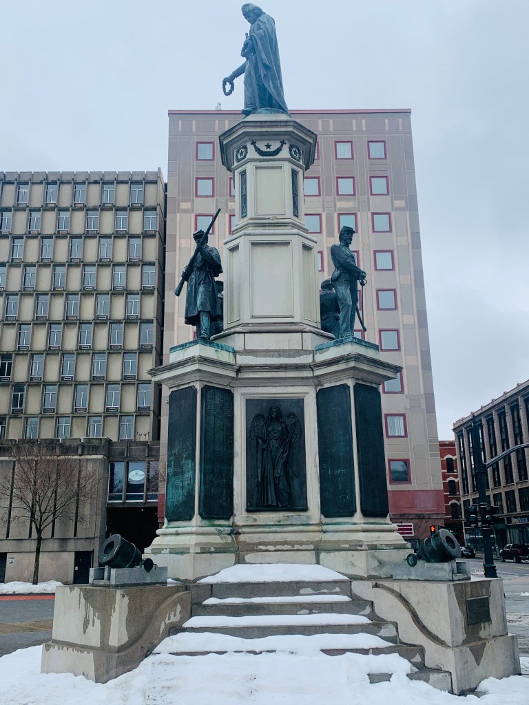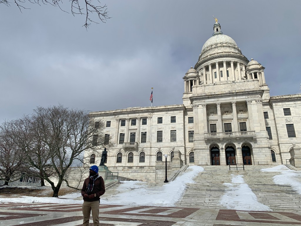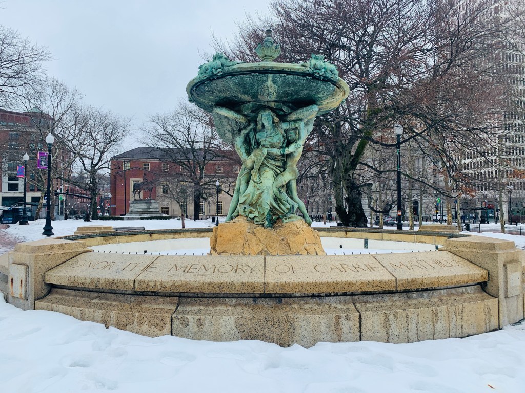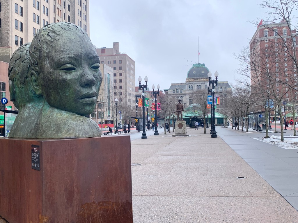 At Waterplace Park, the river moved slowly beneath the bridges. Though famous in warmer months for its fire-lit WaterFire displays, the park carried a different calm in winter. The muted landscape revealed the outline of Providence’s skyline against low clouds. From there, I made my way toward the grand Rhode Island State House, crowned by its marble dome. The dome is the fourth largest self-supporting marble dome in the world, an ambitious statement for America’s smallest state.