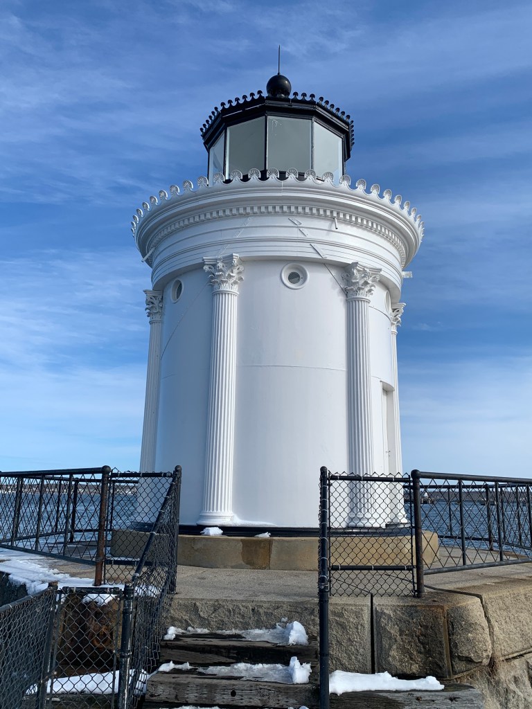 Sunlight poured across Portland’s harbor, reflecting sharply off patches of lingering snow. The air was crisp but clear, the kind of winter day that feels both bracing and generous. I began along the waterfront at Bug Light Lighthouse, officially known as Portland Breakwater Light. Its small size contrasts with its classical design, modeled after ancient Greek architecture. Built in 1875, it once guided ships into one of New England’s busiest ports during an era when Portland thrived as a shipping hub connected to Canada by rail.