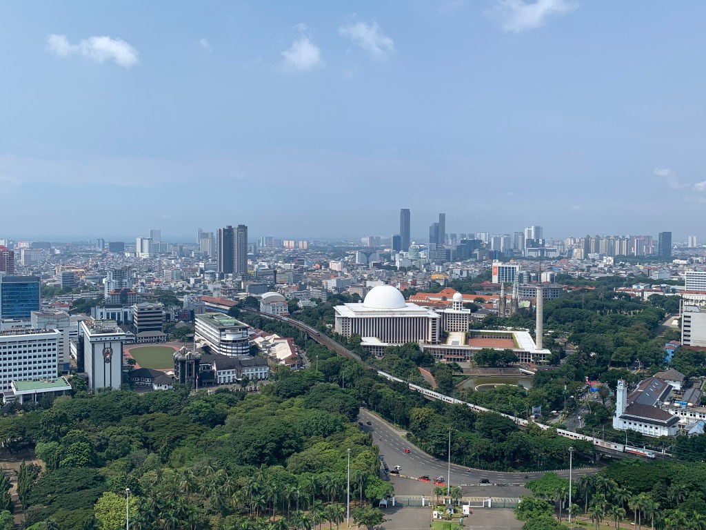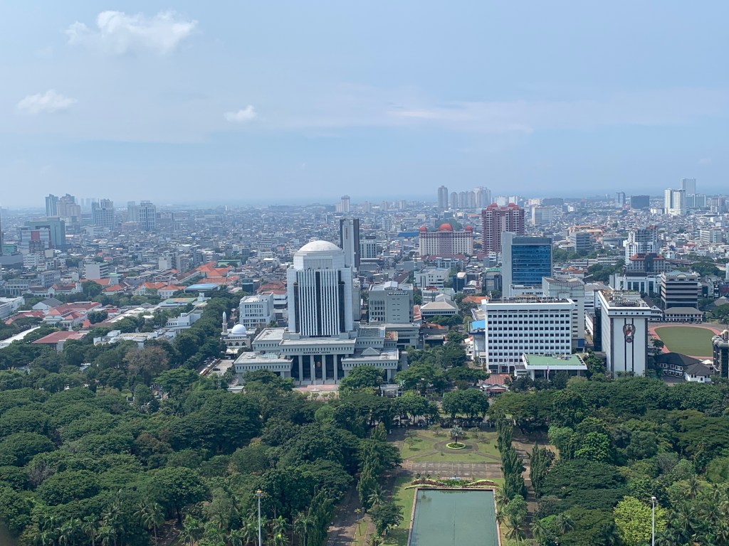 At the National Monument, the experience shifted. Rising 132 meters above the city, Monas was completed in 1975 to commemorate Indonesia’s struggle for independence. The climb to the top revealed a sweeping panorama, where dense neighborhoods, government buildings, and distant high-rises stretched in every direction.